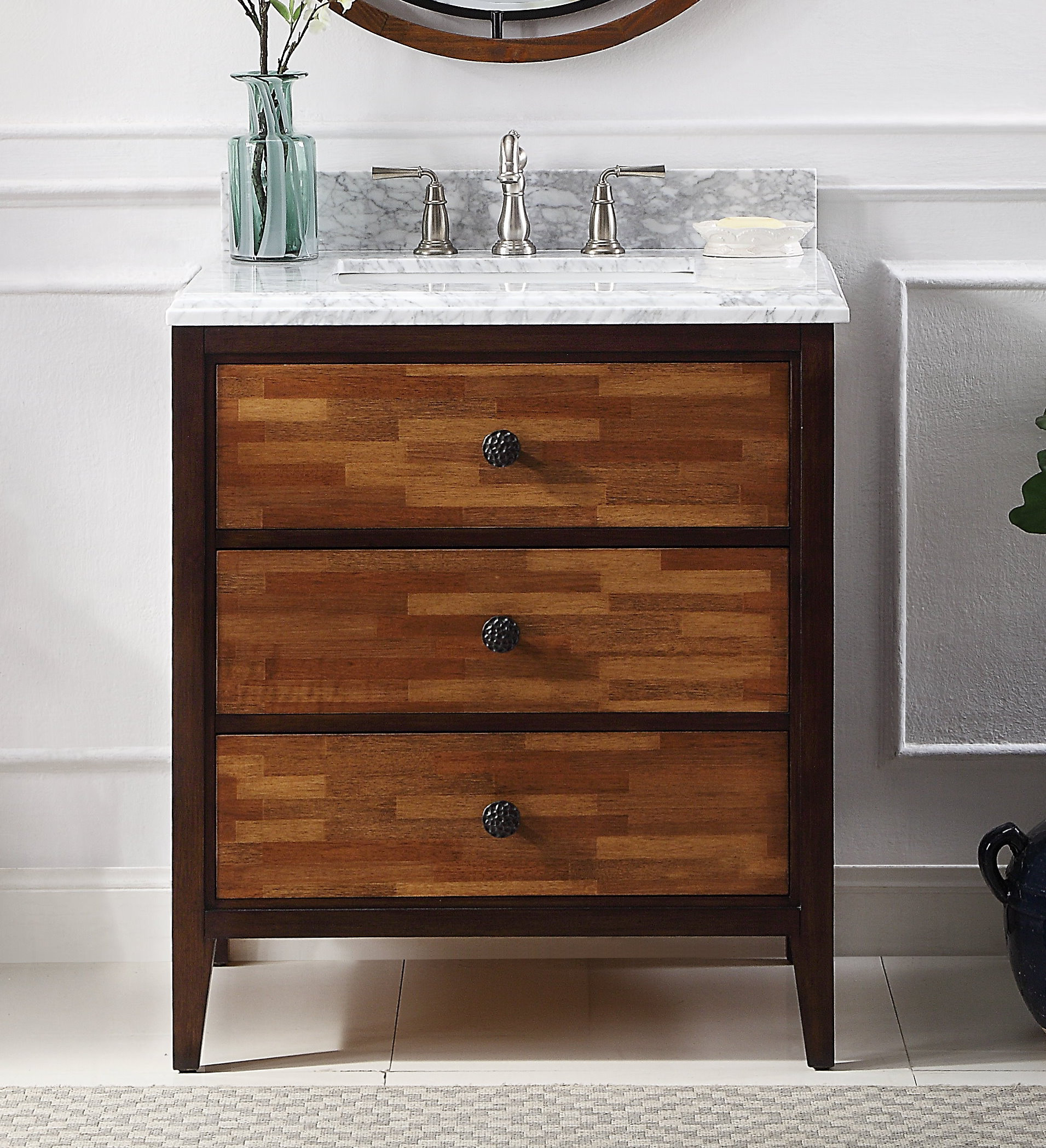 On moreno mob 72 double sink white oak wall mounted modern bathroom vanity with reeinforced acrylic sink. Give an old vanity a fast makeover with fresh paint and repurposed door knockers. A bright orange tile wall is accents the dark stained wooden an orange floor with large scale tiles and white and orange flower tiles plus orange towels for a bright modern bathroom.
