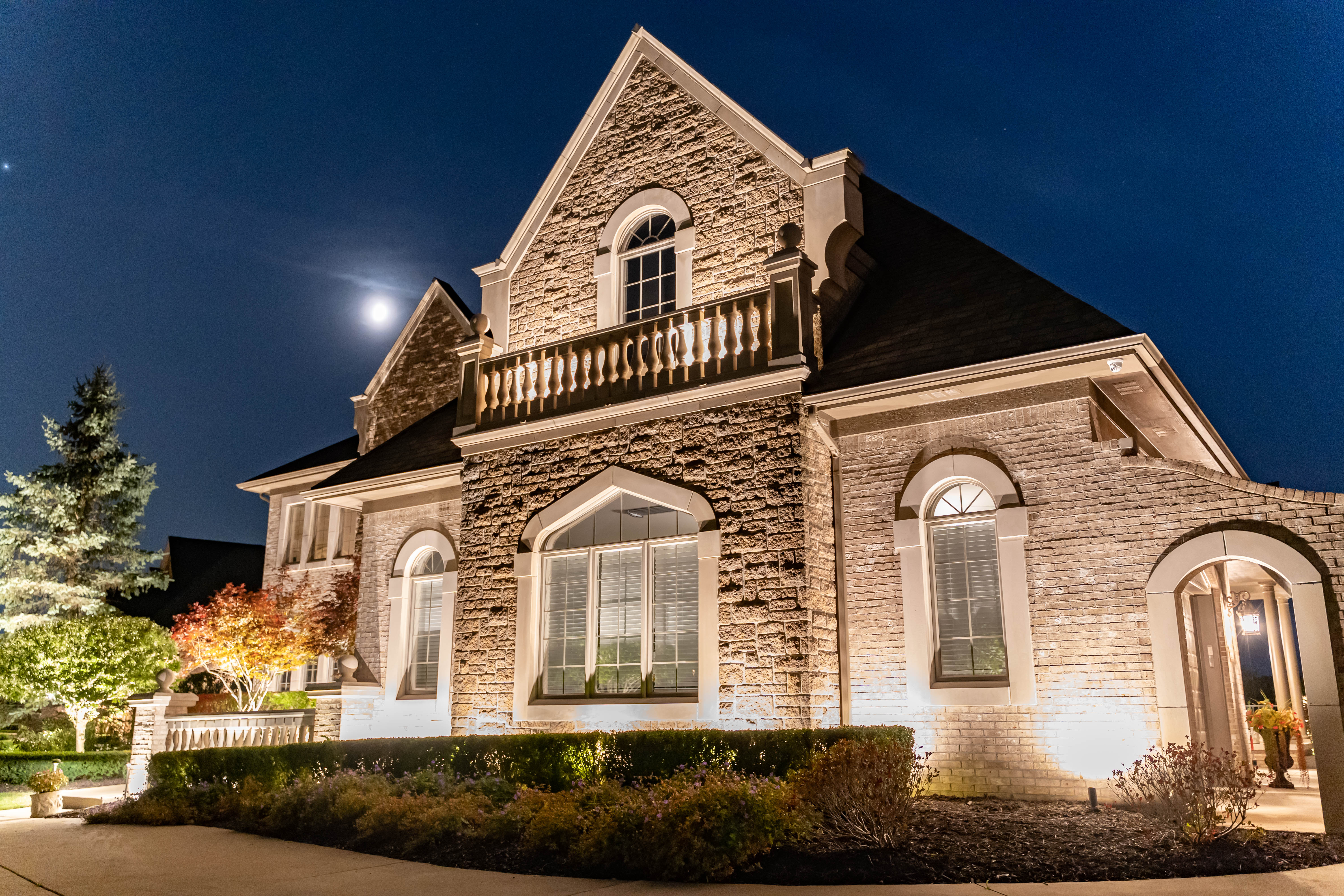 Louis homes brings us the view of lighting that colorfully adorns the trees as well as putting on a show for the wondrous water feature.